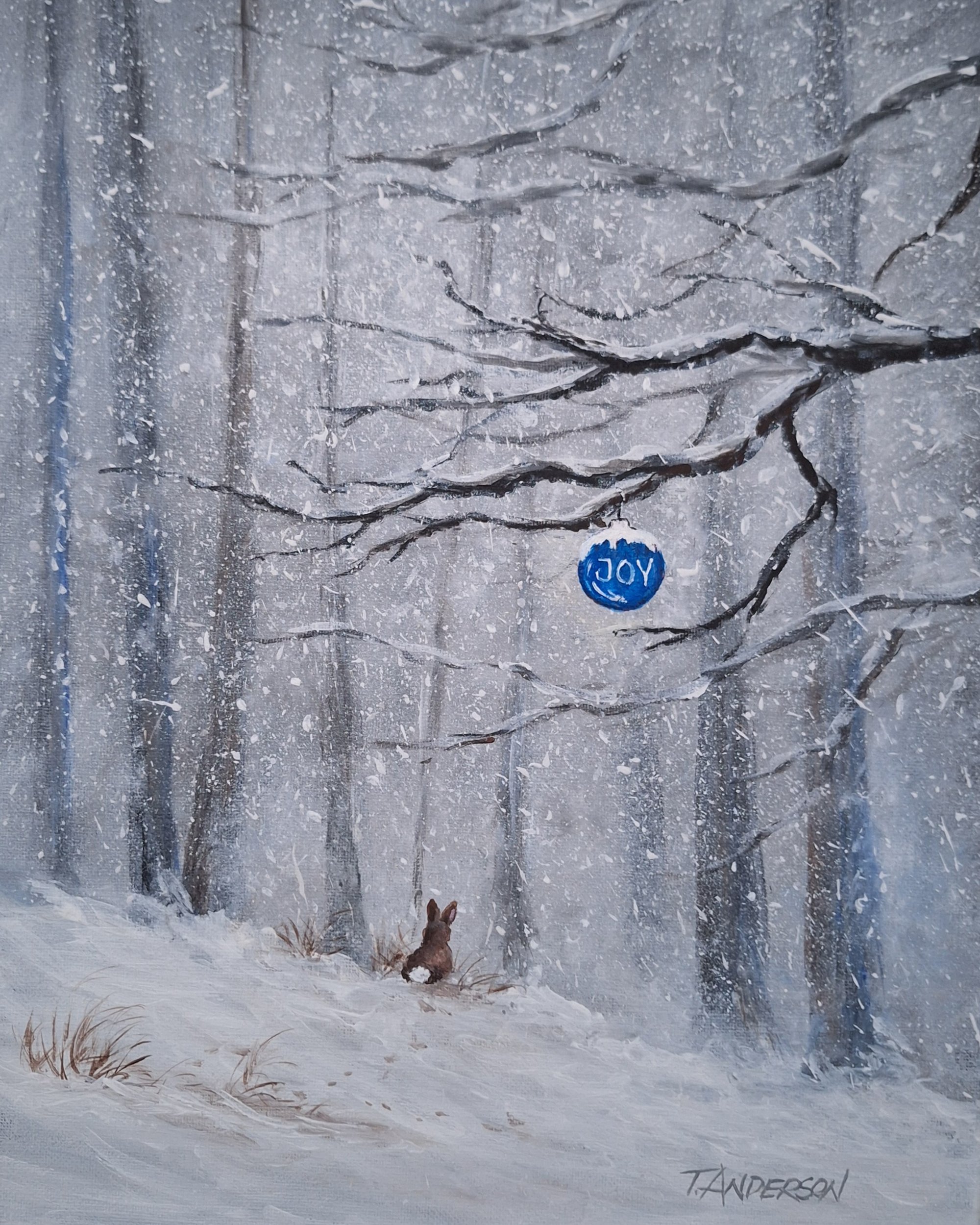 Terry's painting of a Snowy Woods with a blue "Joy" Christmas bulb hanging from a branch.